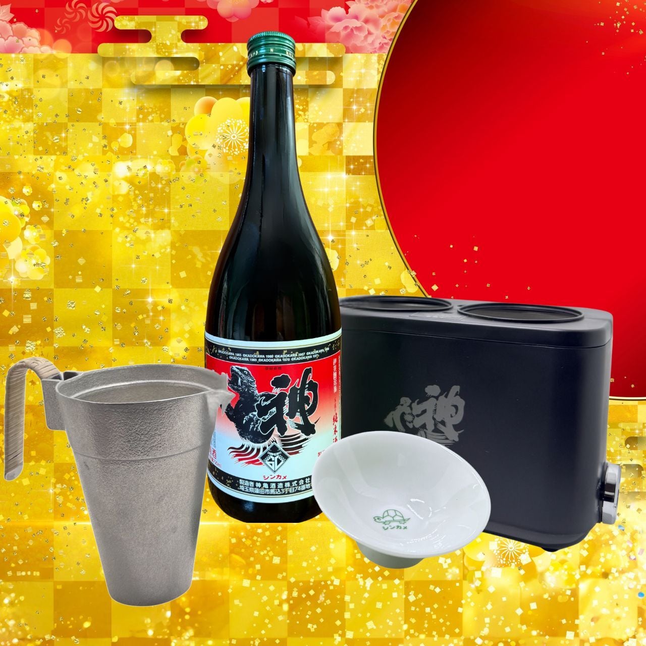 ガメラ60と神亀ロゴ入りかんまかせ、100%錫チロリx1 のセットに、オリジナル平盃x1 をおまけでセットにした、ちょっと贅沢なスターターセット。