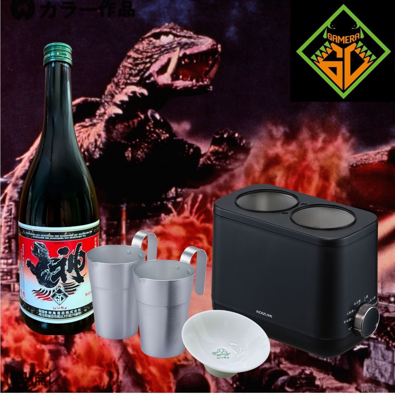 ガメラ生誕60周年記念酒 720mL x1 とNEWかんまかせx1、アルミチロリx2、神亀オリジナル平盃x1のセット。
